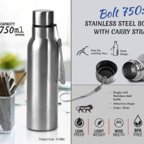 Bolt 750- single wall Stainless steel bottle – With Carry strap – Capacity 750ml approx