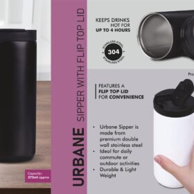 Urbane- Sipper with flip top lid – Keeps hot upto 6 hours – Capacity 350ml approx