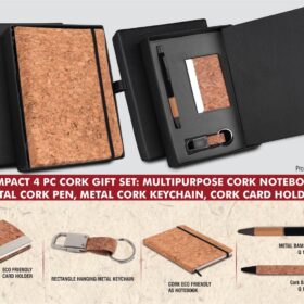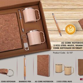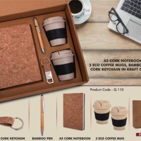 EcoSet 1- Set of A5 Cork notebook, 2 Eco Steel mugs, Bamboo Pen & Cork Keychain in Kraft Gift Box