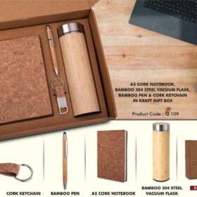 EcoSet 3- Set of A5 Cork notebook, Bamboo 304 Steel Vacuum Flask, Bamboo Pen & Cork Keychain in Kraft Gift Box