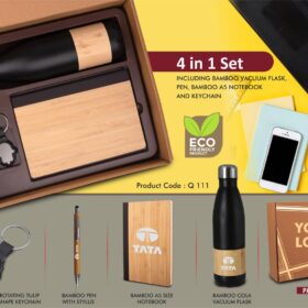 4 in 1 Bamboo set- Keychain, Bamboo vacuum flask, Bamboo pen and A5 bamboo cover notebook in Kraft Gift Box