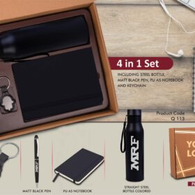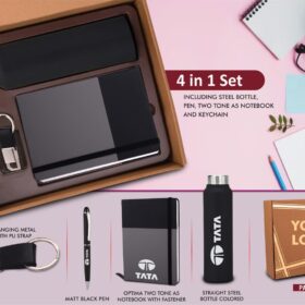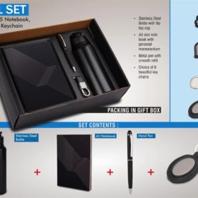 4 in 1 Black set- Tulip shape Keychain, SS Bottle, Metal Pen and A5 PU notebook in Kraft Gift Box