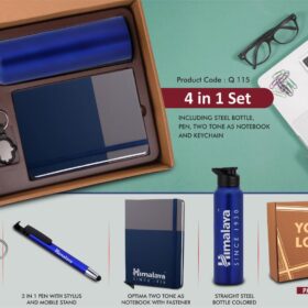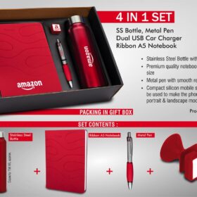 4 in 1 set: Steel bottle, Metal pen, Silicon mobile stand, Ribbon PU notebook