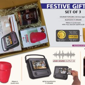 Festive Gift Set of 3- Premium Glass mug, Bluetooth TV Speaker and Gourmet Popcorn – Metal Plate included