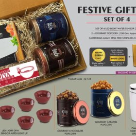 Festive Gift Set of 4- 6 pc diya set, Magic Suction mug and 2 x Gourmet Popcorn – Metal Plate included