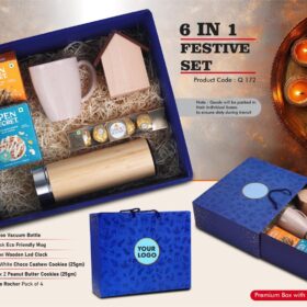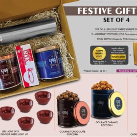 Festive Gift Set of 4- 6 pc diya set, Premium Glass mug, 3 Step Lamp and Gourmet Popcorn – Metal Plate included