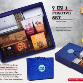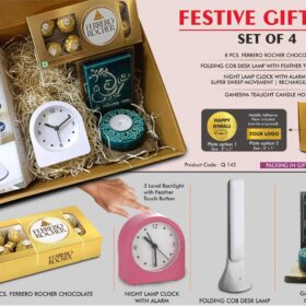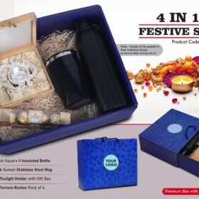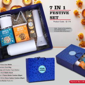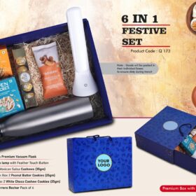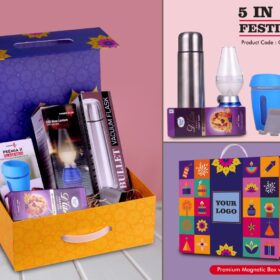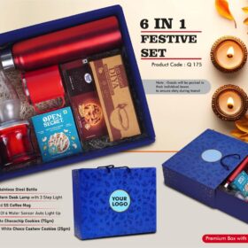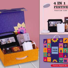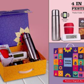 Diwali Set of 5- Rechargeable Table Lamp, Premium SS Suction Mug, Bullet Vacuum Flask, Sugarfree D’Lite Cookies in Magnetic Gift Box with Handle