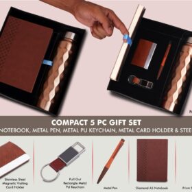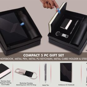Compact 5 Pc Black Gift Set- A5 Size Notebook, Metal Pen, Metal Pu Keychain, Metal Card Holder and Straight Steel Bottle