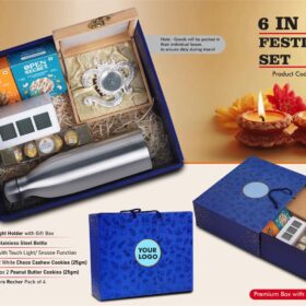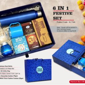 Festive Set of 6- SS Bottle 1L, Decorative LED Blow Lamp, SS Coffee Mug, 2 Choco Cashew Cookies, LED Light Diya Set of 6, Sugarfree Choco Chip Oat Cookies