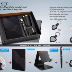 5 in 1 set: Foggy SS coffee mug, Metal pen, Metal mobile stand, A5 notebook and Keychain