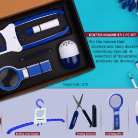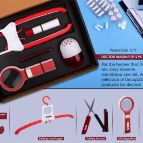 Doctor Magnifier set- Folding Coat hanger, Lint remover, Folding scissors, LED Magnifier, Capsule shape Air freshener – 5 pc set