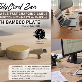 TidyCord Zen- Retractable Fast Charging cable with Data function in Wheat Straw material with Bamboo plate – Dual Input