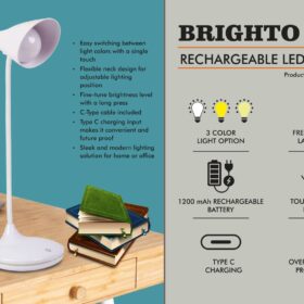 Brighto 2.0 – Rechargeable LED lamp – 3 Color light with Brightness adjustment – Type C Charging
