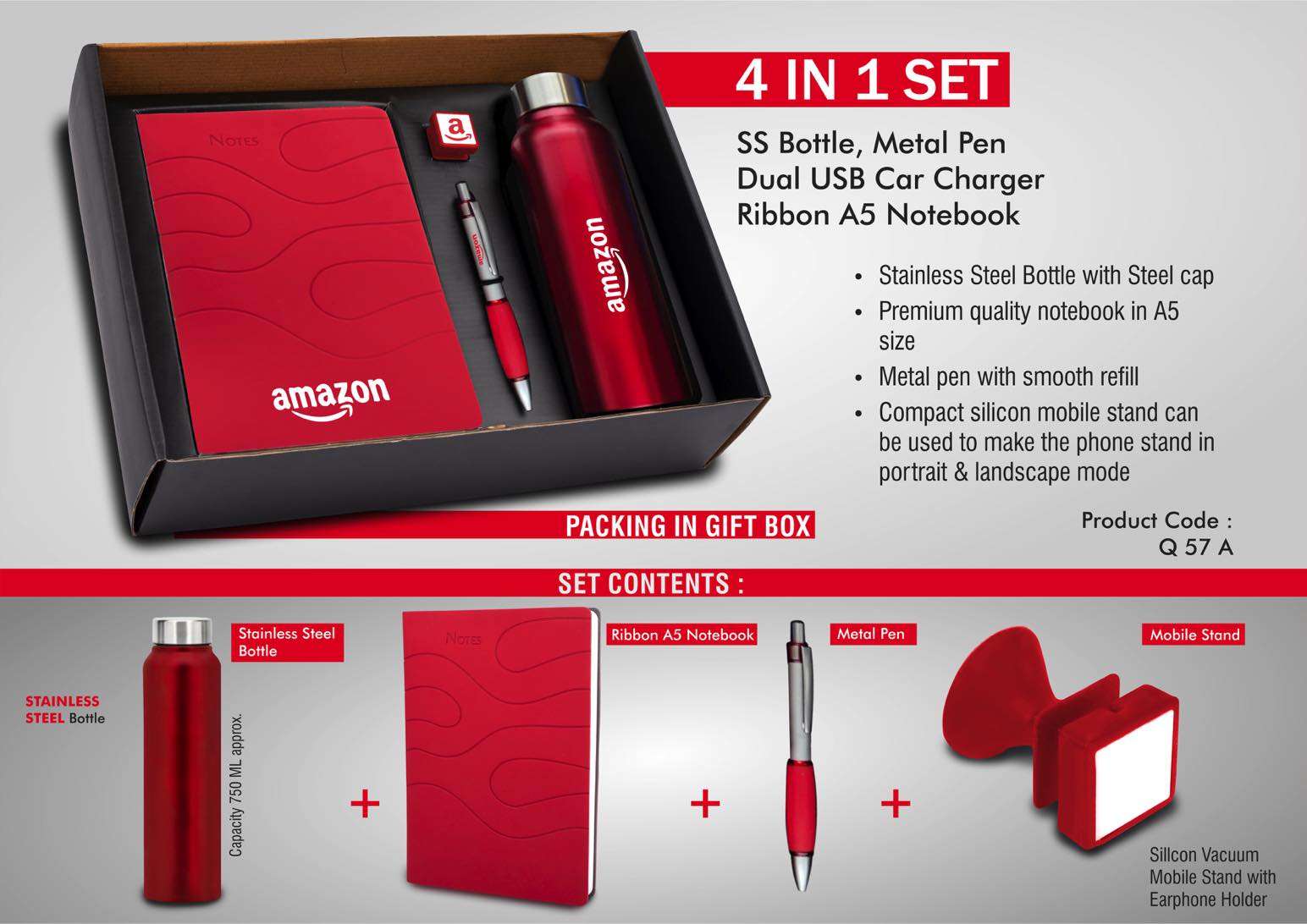 4 in 1 set: Steel bottle, Metal pen, Silicon mobile stand, Ribbon PU notebook