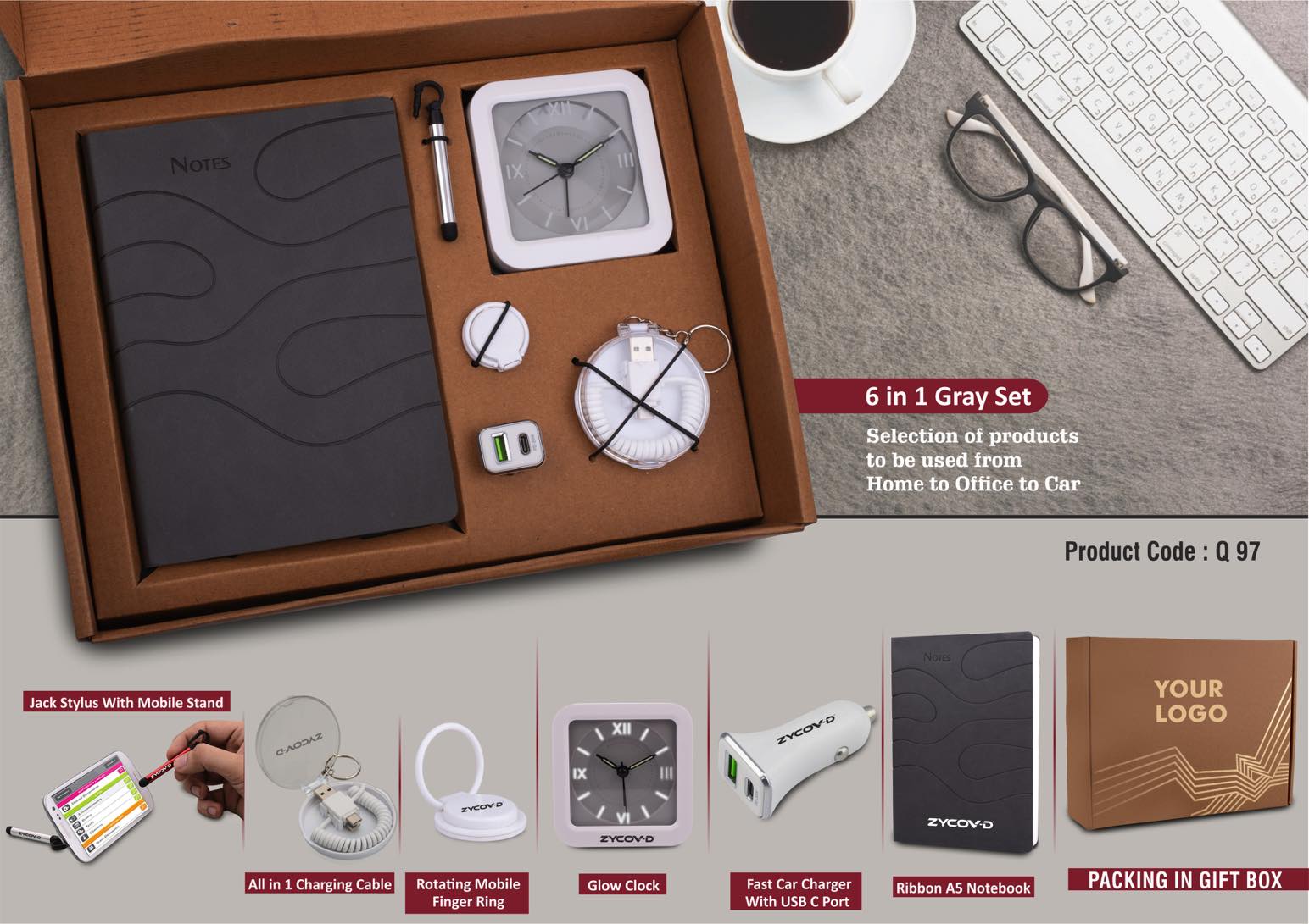 6 in 1 Gray set- Mobile Finger ring, All in 1 Cable with Keychain, Fast Dual USB Car charger, Jack stylus with phone stand, Glow Clock and A5 PU notebook in Kraft Gift Box