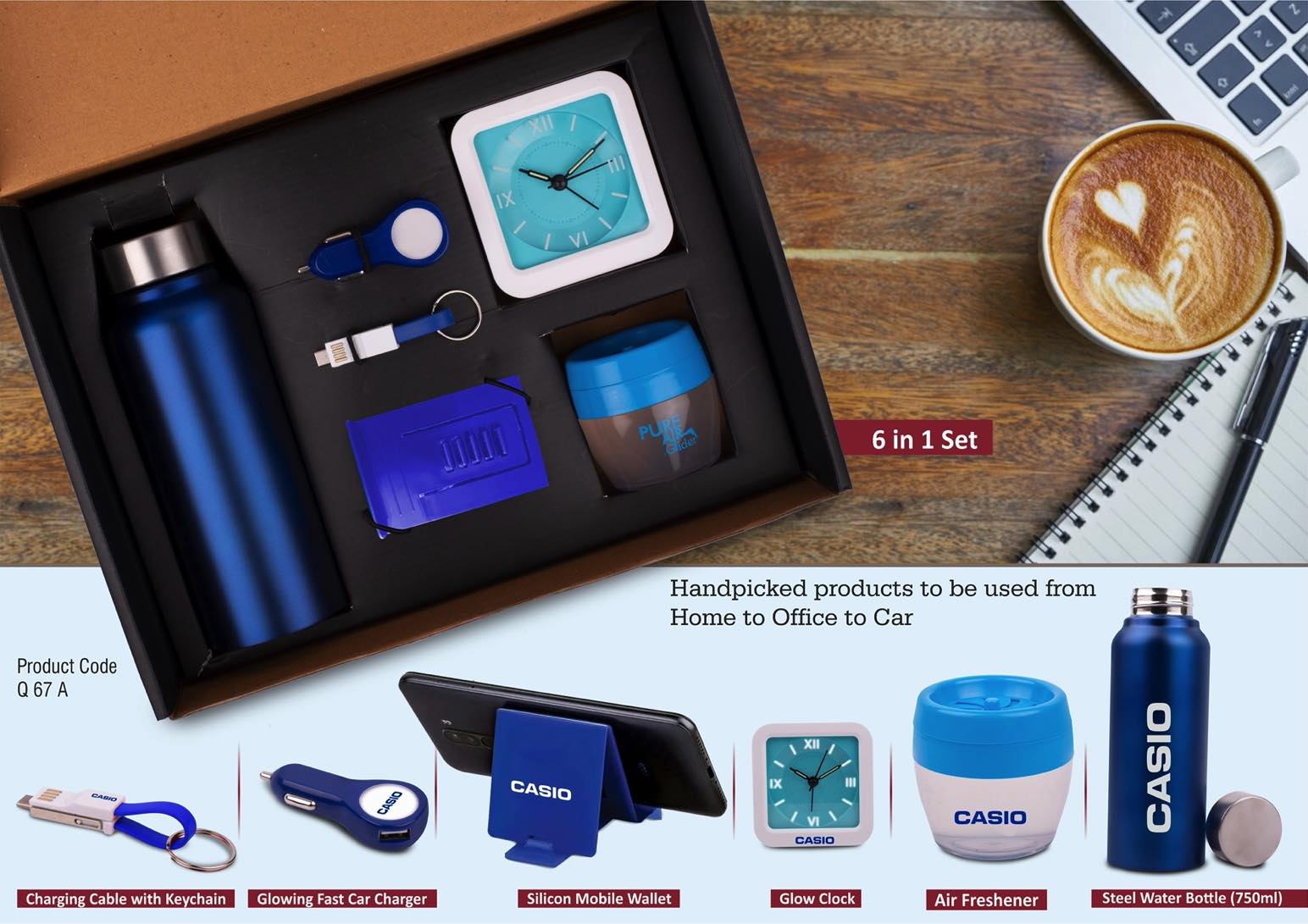6 in 1 set- Steel Water bottle (750ml), Mobile stand, Charging cable with keychain, Glowing Car charger, Glow Clock, Large Air freshener