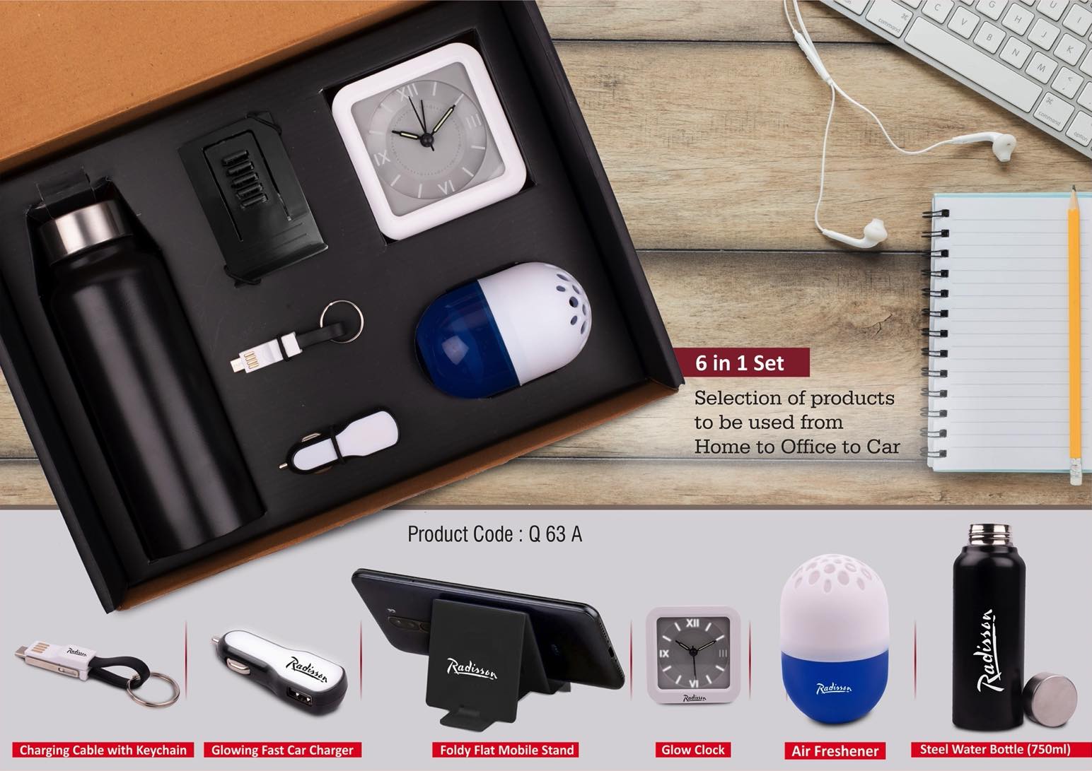 6 in 1 set- Steel Water bottle (750ml), Mobile stand, Charging cable with keychain, Glowing Fast Car charger, Glow Clock, Air freshener