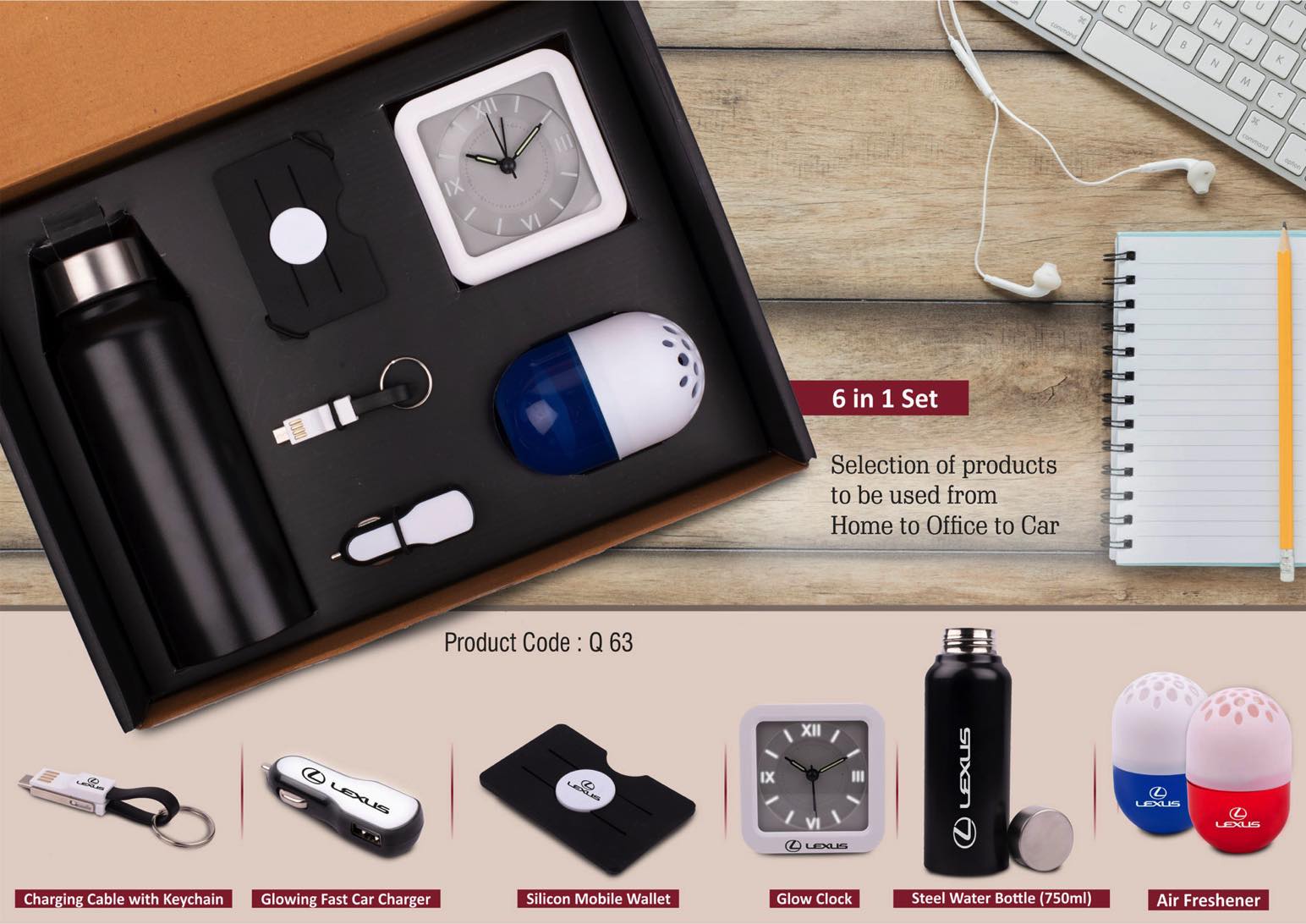6 in 1 set- Steel Water bottle (750ml), Silicon mobile wallet, Charging cable with keychain, Glowing Fast Car charger, Glow Clock, air freshener