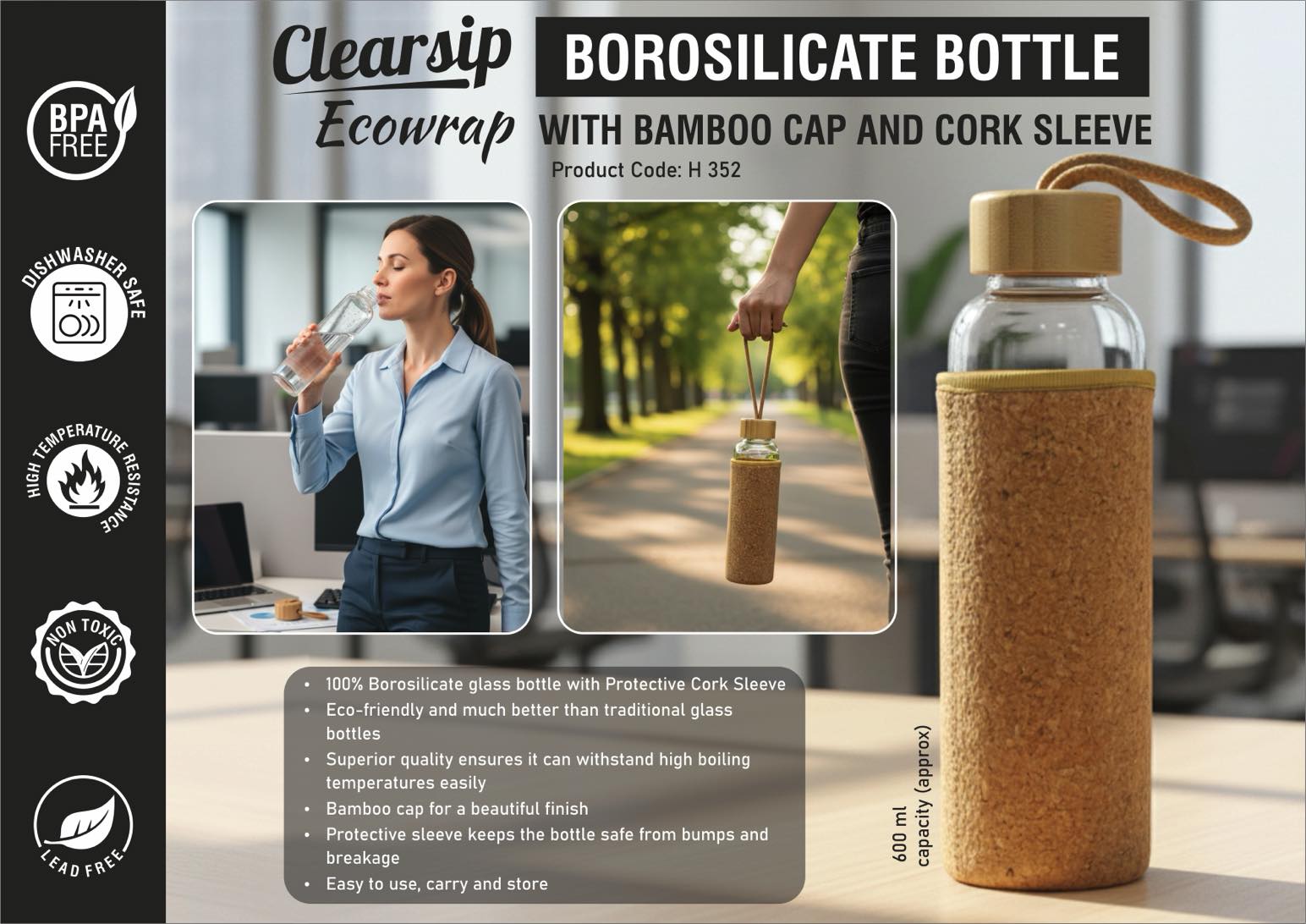 ClearSip EcoWrap: Borosilicate glass bottle with Bamboo Cap and Cork sleeve – Capacity 600ml (approx)