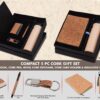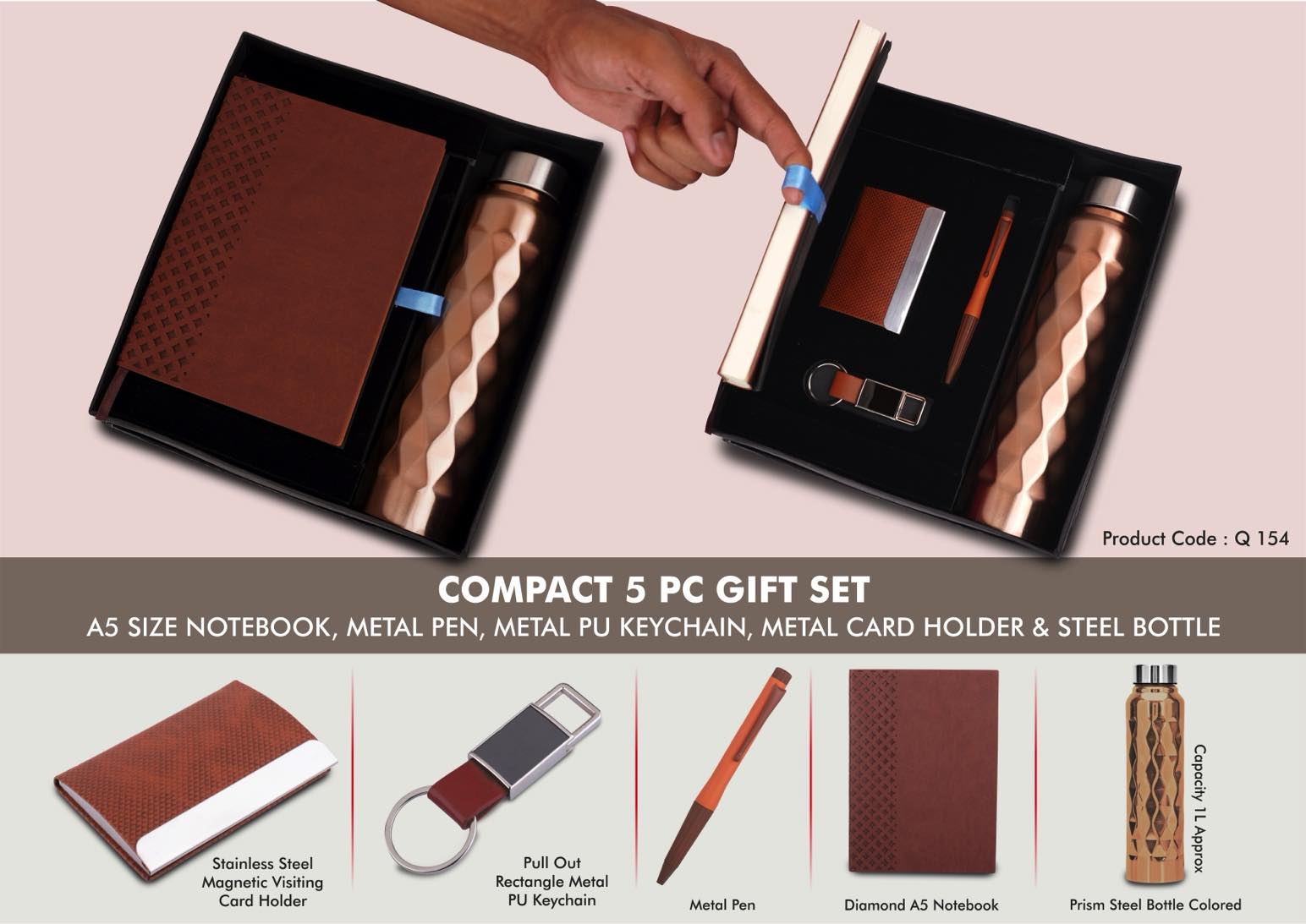 Compact 5 Pc Tan Gift Set- A5 Size Notebook, Metal Pen, Metal Pu Keychain, Metal Card Holder and Prism Steel Bottle