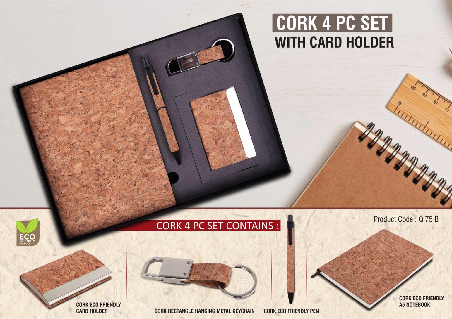 EcoSet 2- Set of A5 Cork notebook, Eco Steel mug, Bamboo Pen, Cork Keychain & Cork Sticky notepad in Kraft Gift Box