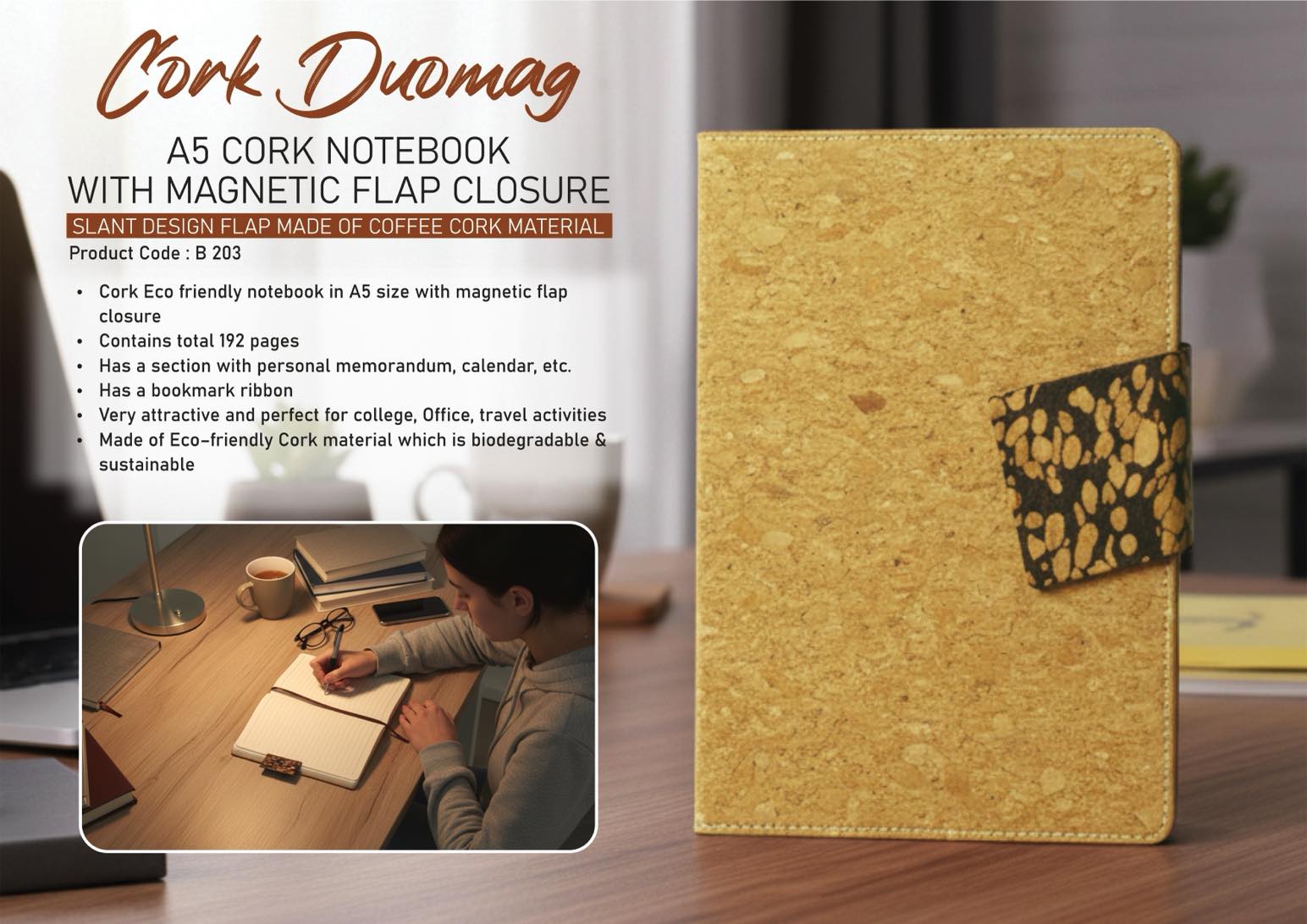 Cork Duomag- A5 Cork Notebook with magnetic flap closure – Slant design Flap made of Coffee cork material – A5 size – With memorandum and Bookmark ribbon