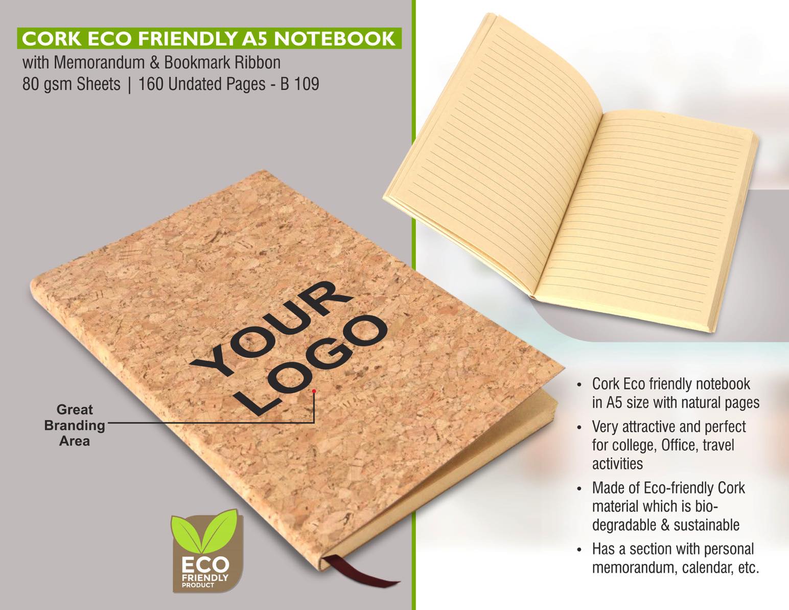 Cork Eco friendly A5 notebook with memorandum and Bookmark ribbon- 80 gsm sheets – 160 undated pages