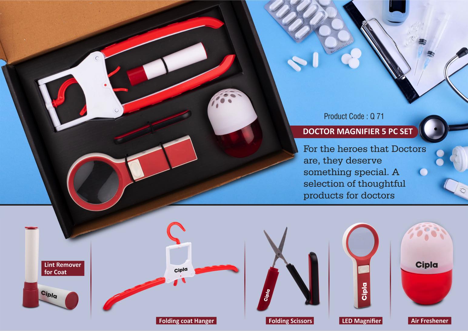Doctor Magnifier set- Folding Coat hanger, Lint remover, Folding scissors, LED Magnifier, Capsule shape Air freshener – 5 pc set