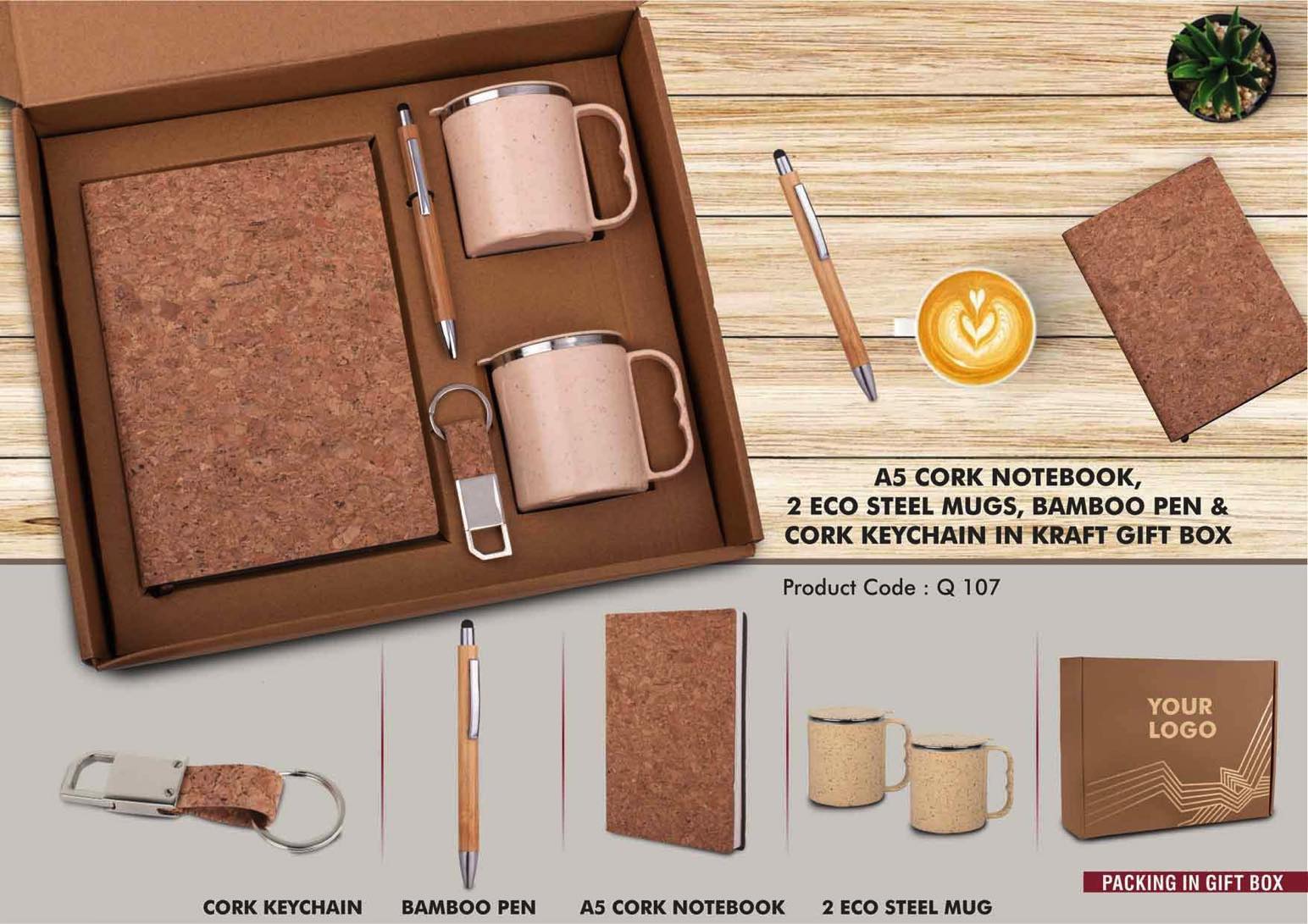 EcoSet 1- Set of A5 Cork notebook, 2 Eco Steel mugs, Bamboo Pen & Cork Keychain in Kraft Gift Box