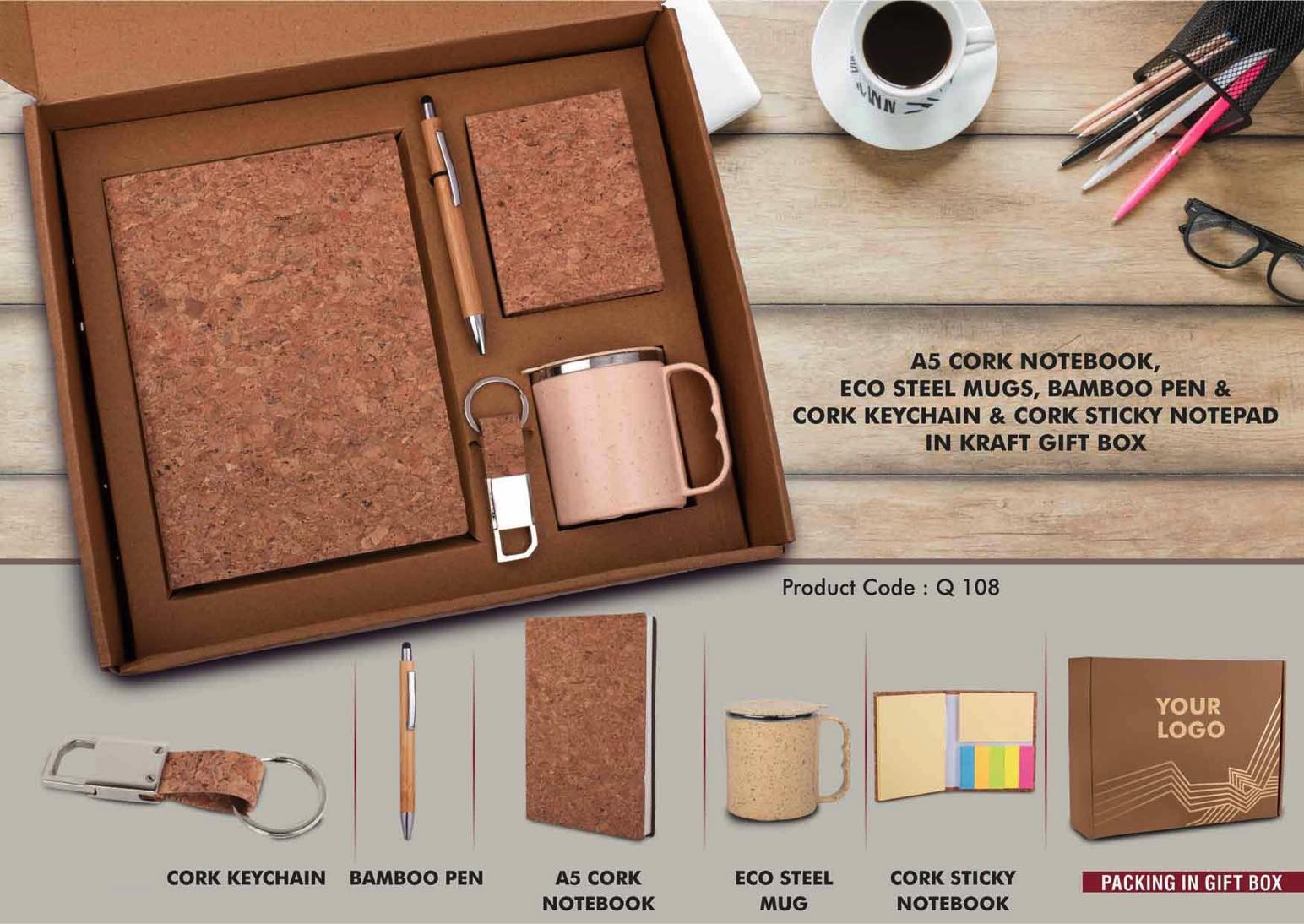 EcoSet 2- Set of A5 Cork notebook, Eco Steel mug, Bamboo Pen, Cork Keychain & Cork Sticky notepad in Kraft Gift Box