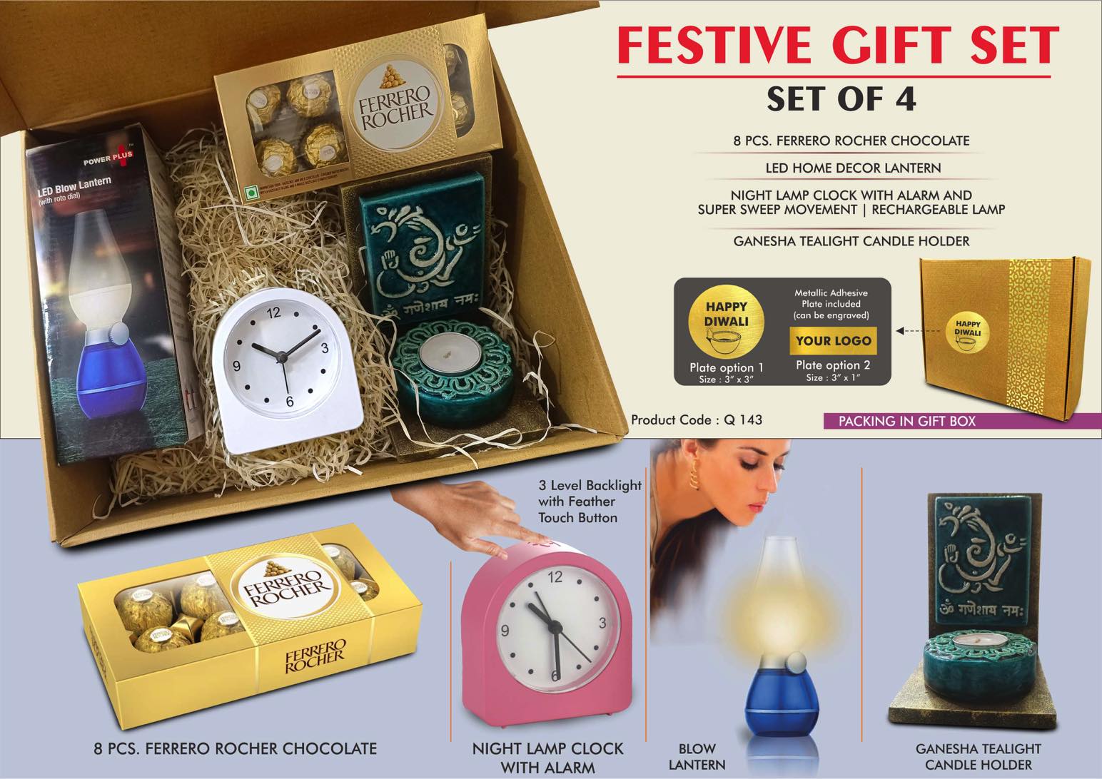 Festive Gift Set of 4- Ferrero Rocher 8 pc box, Ganesha Tealight Holder, Night Lamp Clock and Blow Lantern – Metal Plate included