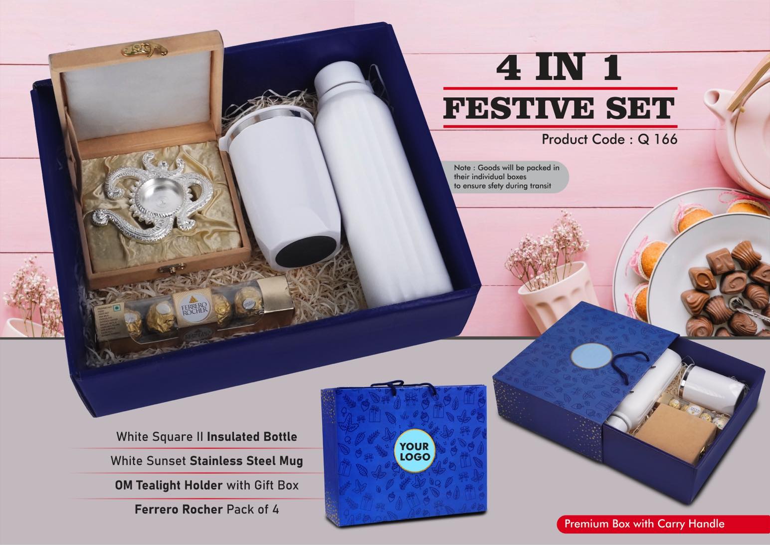 Festive Gift Set of 4- Om Tealight holder, Square Insulated Bottle, Stainless Steel Mug and Ferrero Rocher Pack of 4