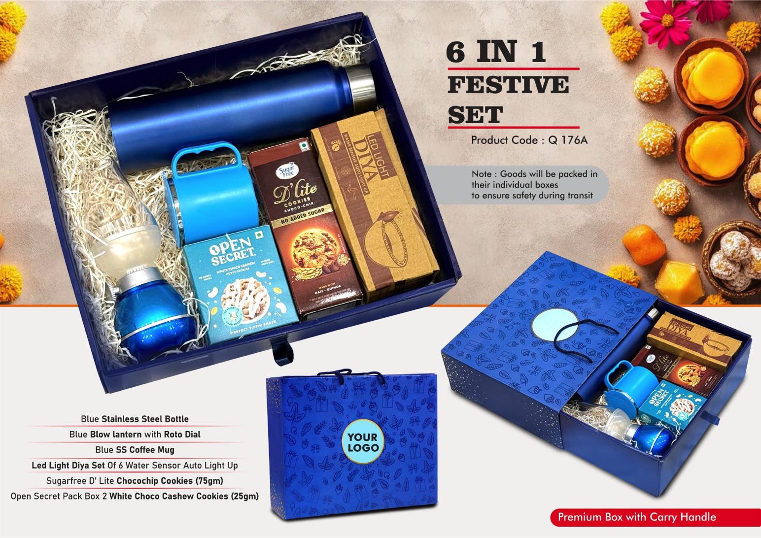 Festive Set of 6- SS Bottle 1L, Decorative LED Blow Lamp, SS Coffee Mug, 2 Choco Cashew Cookies, LED Light Diya Set of 6, Sugarfree Choco Chip Oat Cookies