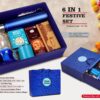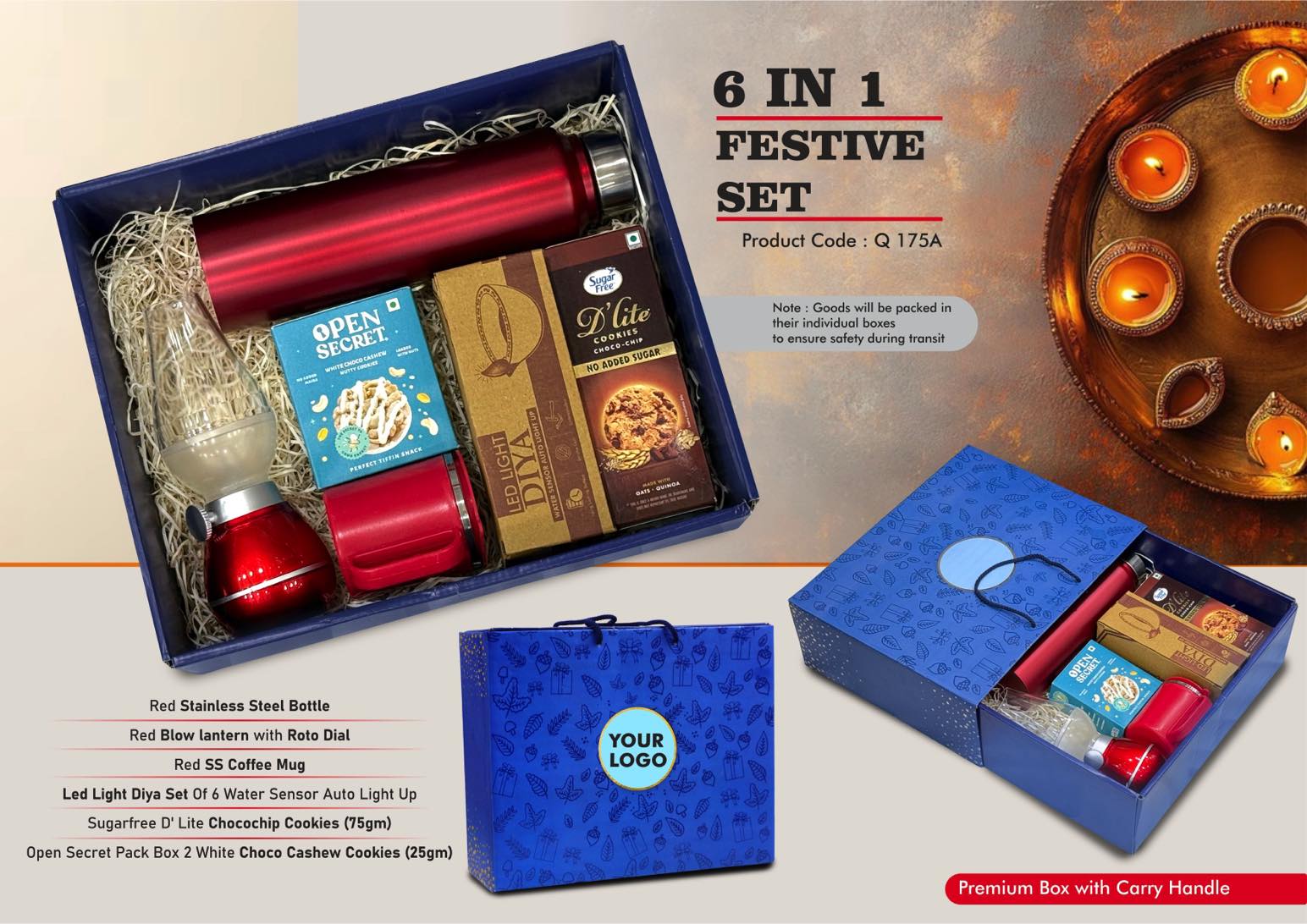Festive Set of 6- SS Bottle 1L, Decorative LED Blow Lamp, SS Coffee Mug, 2 Choco Cashew Cookies, LED Light Diya Set of 6, Sugarfree Choco Chip Oat Cookies