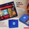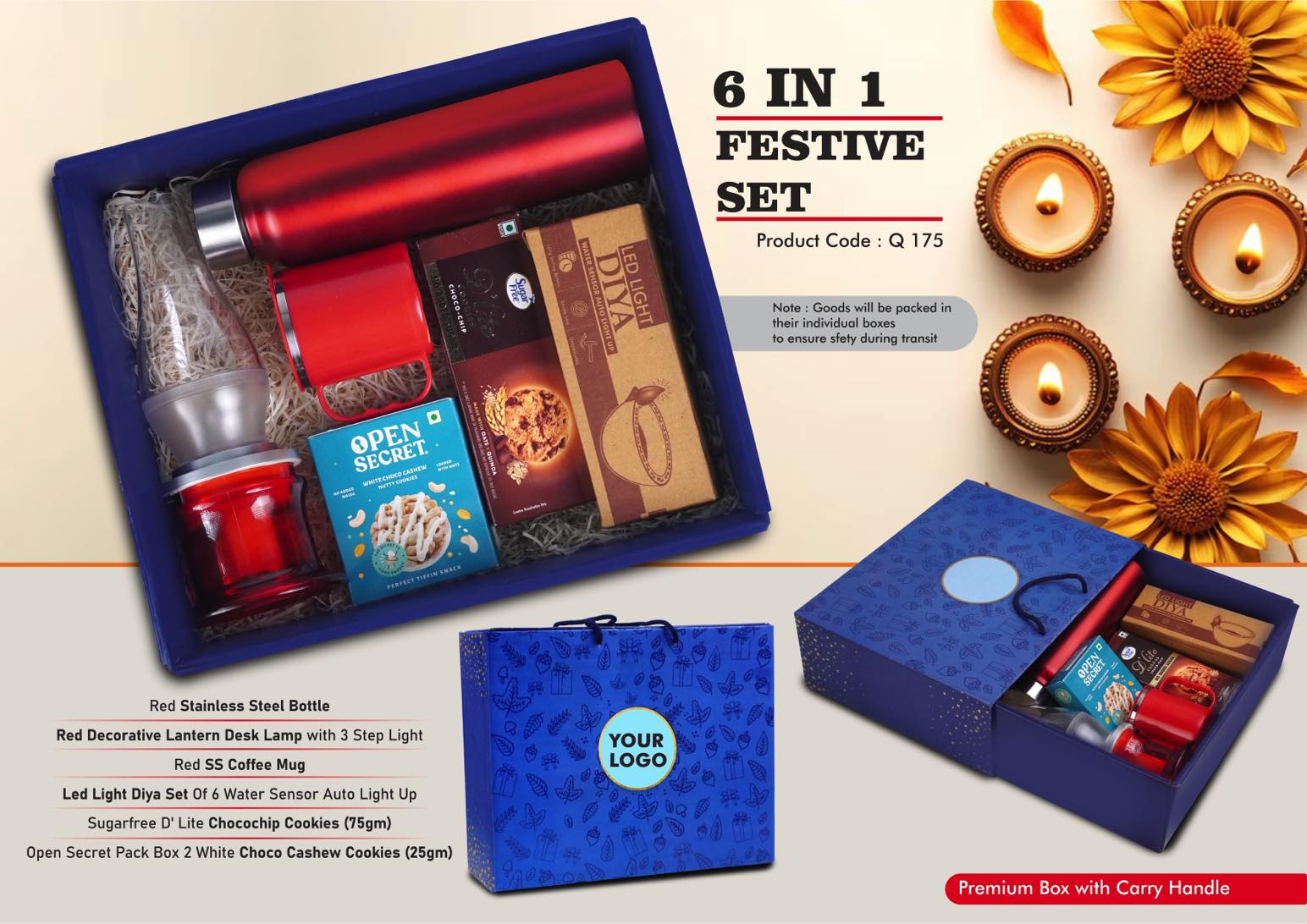 Festive Set of 6- SS Bottle 1L, Decorative LED Lamp, SS Coffee Mug, 2 Choco Cashew Cookies, LED Light Diya Set of 6, Sugarfree Choco Chip Oat Cookies