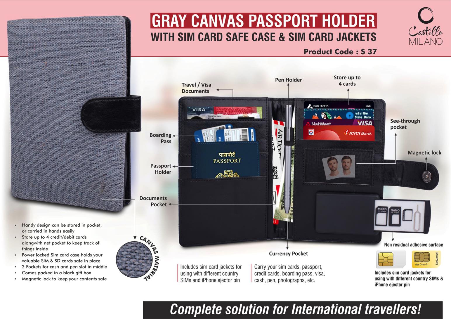 Gray Canvas Passport holder with Sim Card Safe Case and Sim Card Jackets