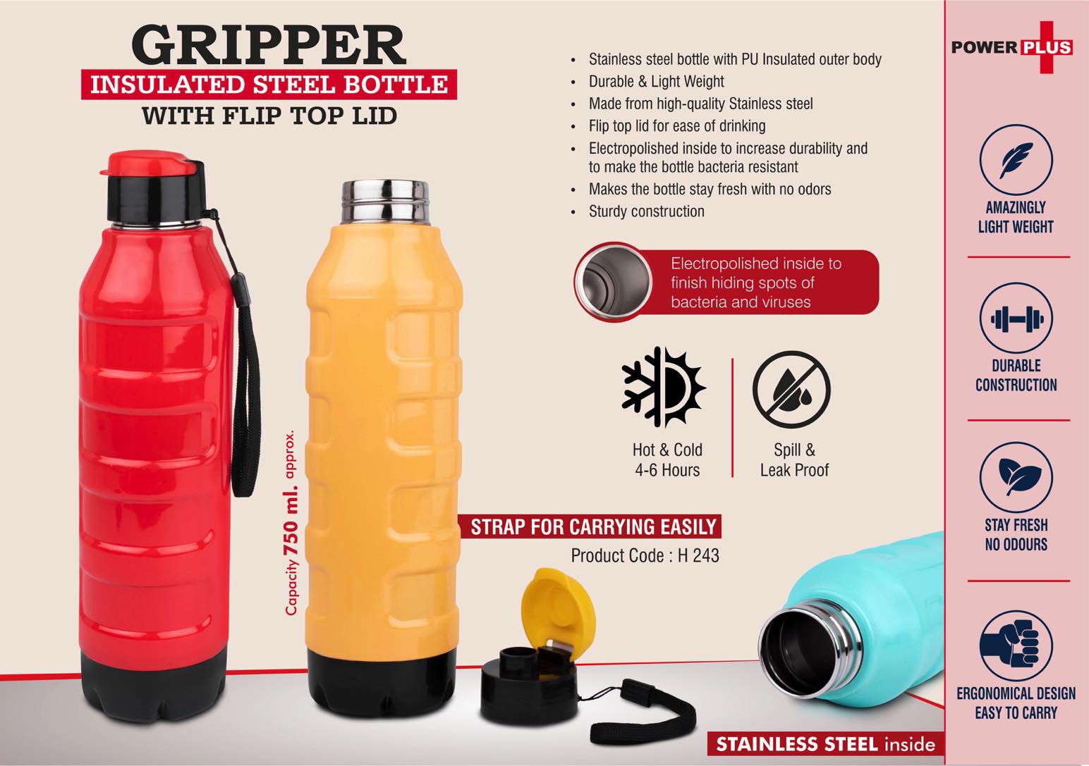 Gripper- Insulated Steel Bottle with Flip top lid – Keeps Hot AND Cold for 4-6 Hours – Strap for Carrying easily – Capacity 750 ml approx