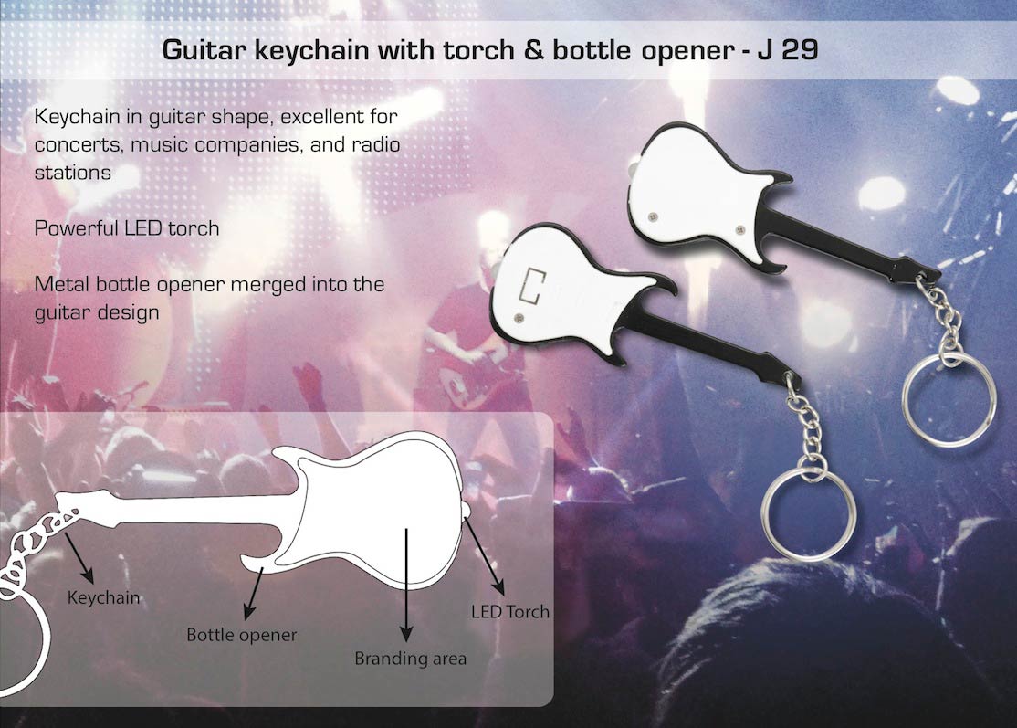 Guitar key chain with torch & bottle opener