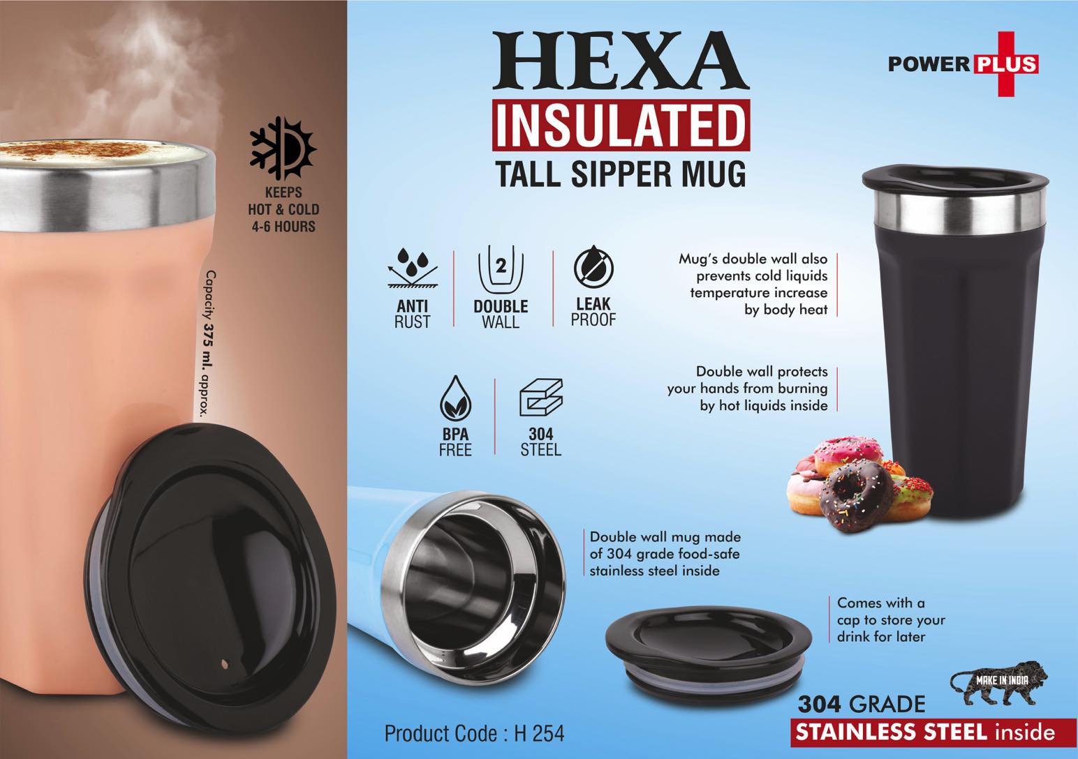 Hexa Insulated – Tall sipper mug with temperature retention – 304 grade Stainless steel inside – Keeps hot upto 4 hours – Capacity 375ml approx