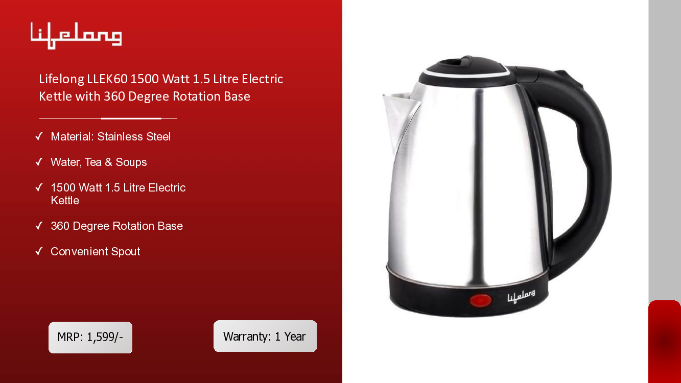 Lifelong 1500 Watt 1.5 Litre Electric Kettle with 360 Degree Rotation Base