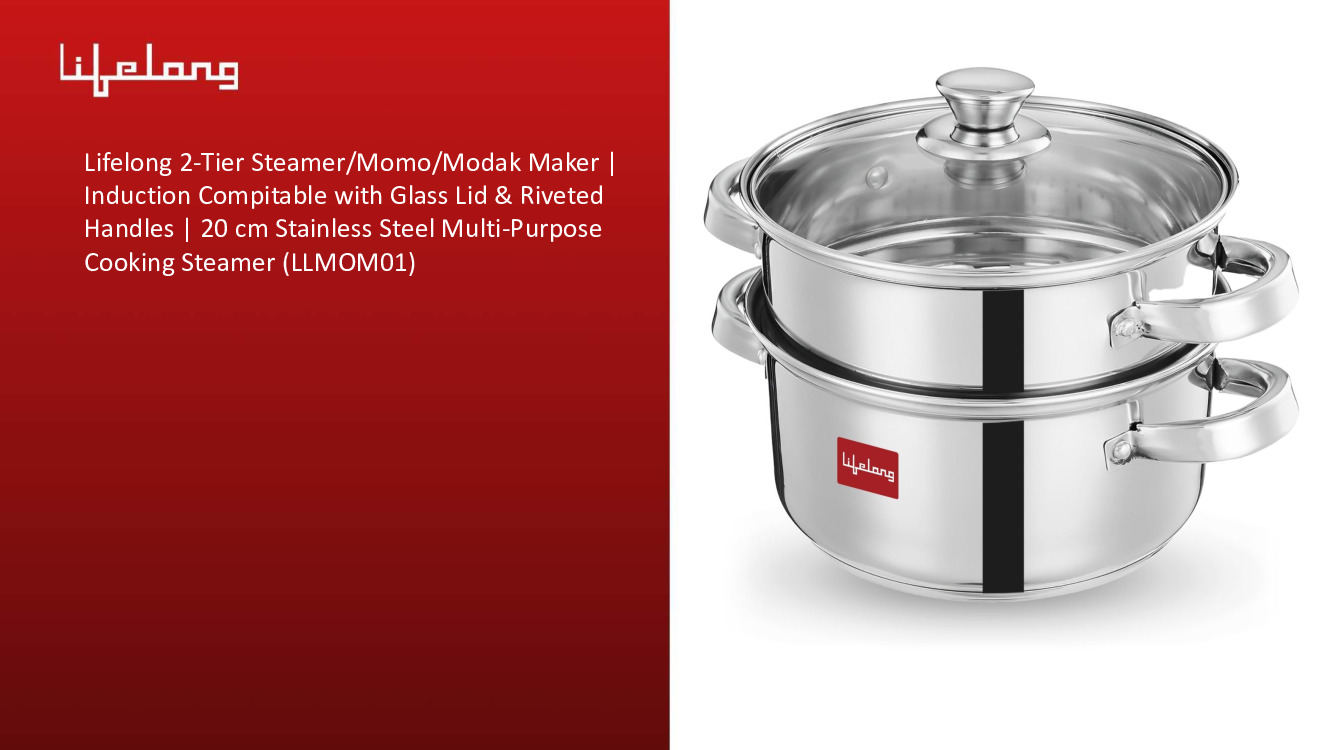 Lifelong 2-Tier Steamer/Momo/Modak Maker | Induction Compitable with Glass Lid & Riveted Handles | 20 cm Stainless Steel Multi-Purpose Cooking Steamer
