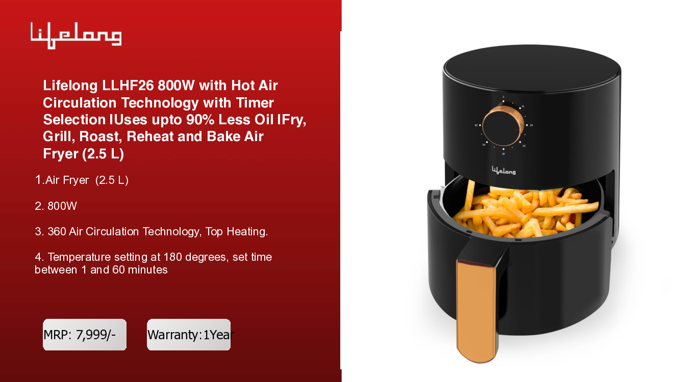 Lifelong 800W with Hot Air Circulation Technology with Timer Selection |Uses upto 90% Less Oil |Fry, Grill, Roast, Reheat and Bake Air Fryer (2.5 L)