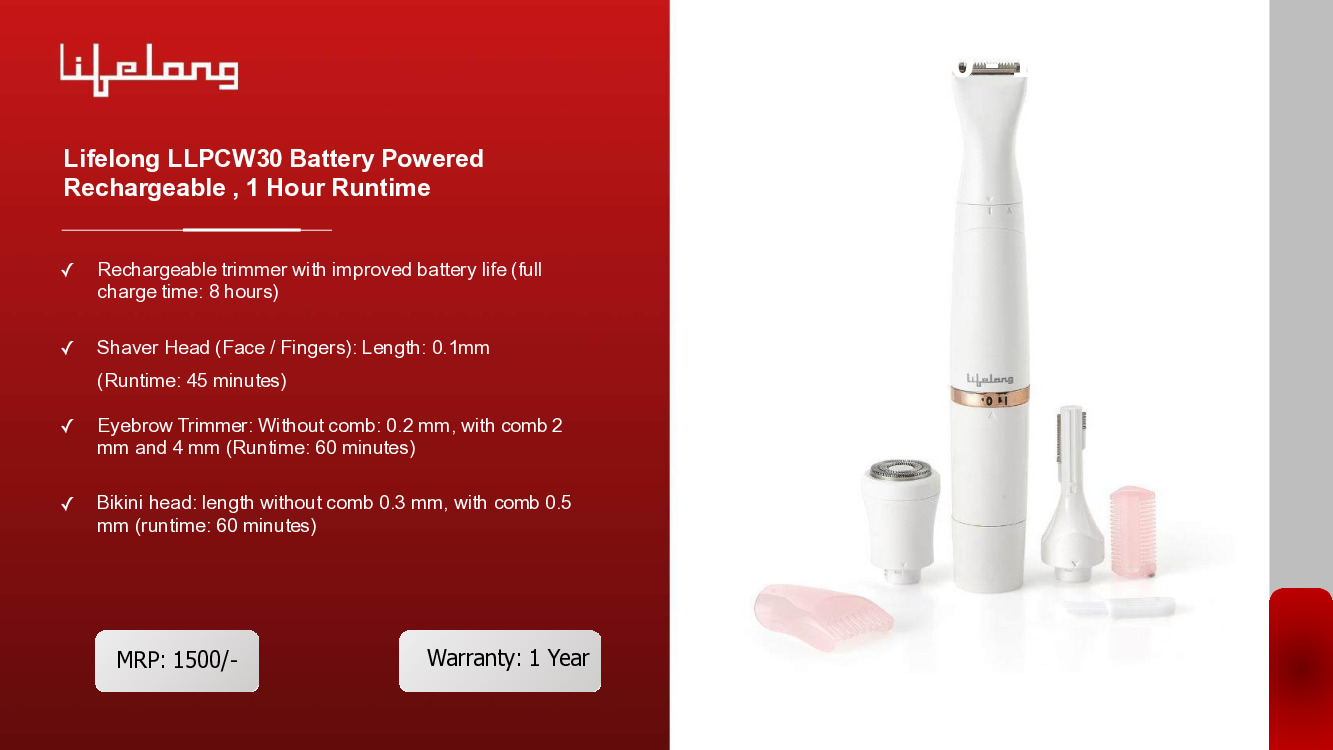 Lifelong Battery Powered Rechargeable Trimmer, 1 Hour Runtime