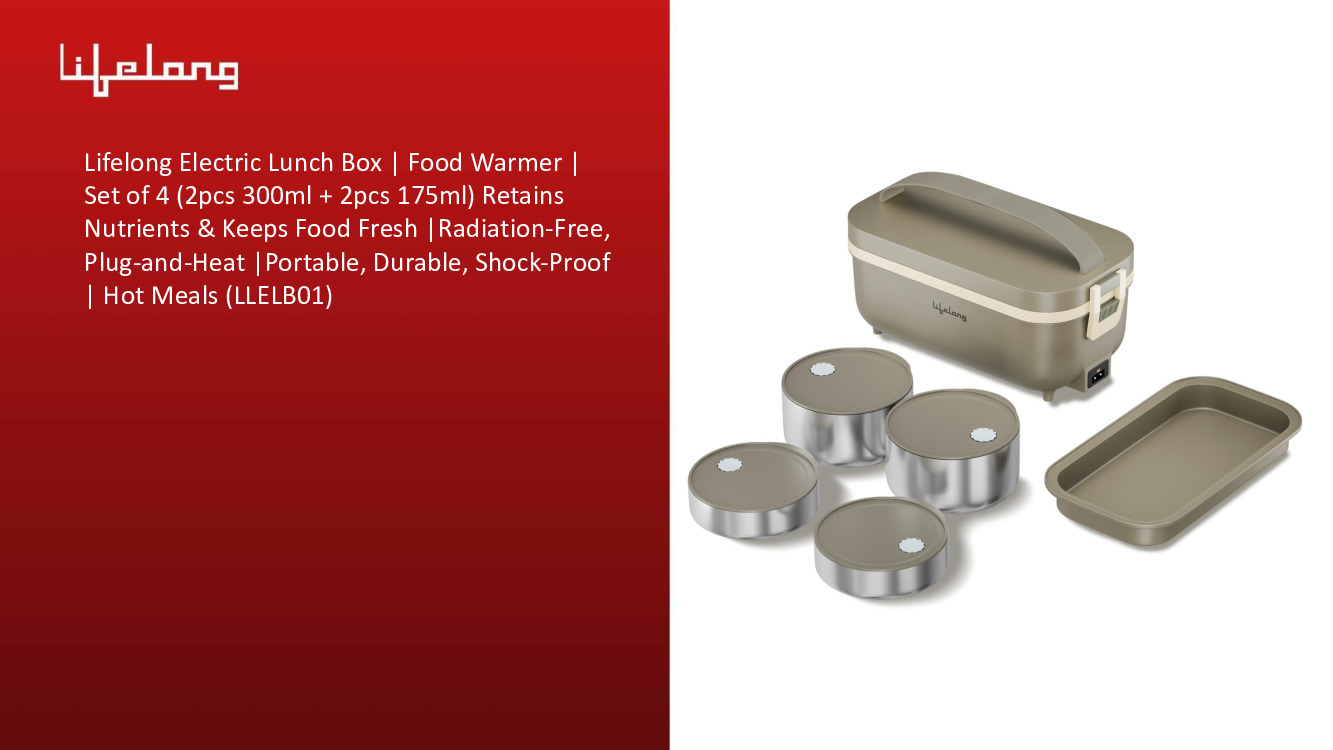 Lifelong Electric Lunch Box | Food Warmer | Set of 4 (2pcs 300ml + 2pcs 175ml) Retains Nutrients & Keeps Food Fresh |Radiation-Free, Plug-and-Heat |Portable, Durable, Shock-Proof | Hot Meals