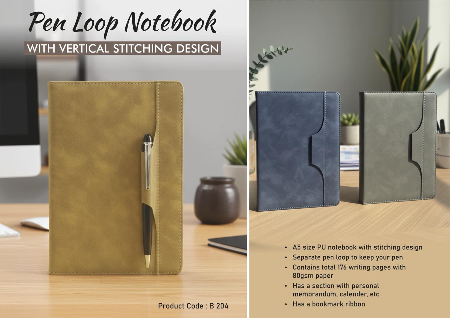 Pen Loop notebook with Vertical Stitching design and bookmark ribbon
