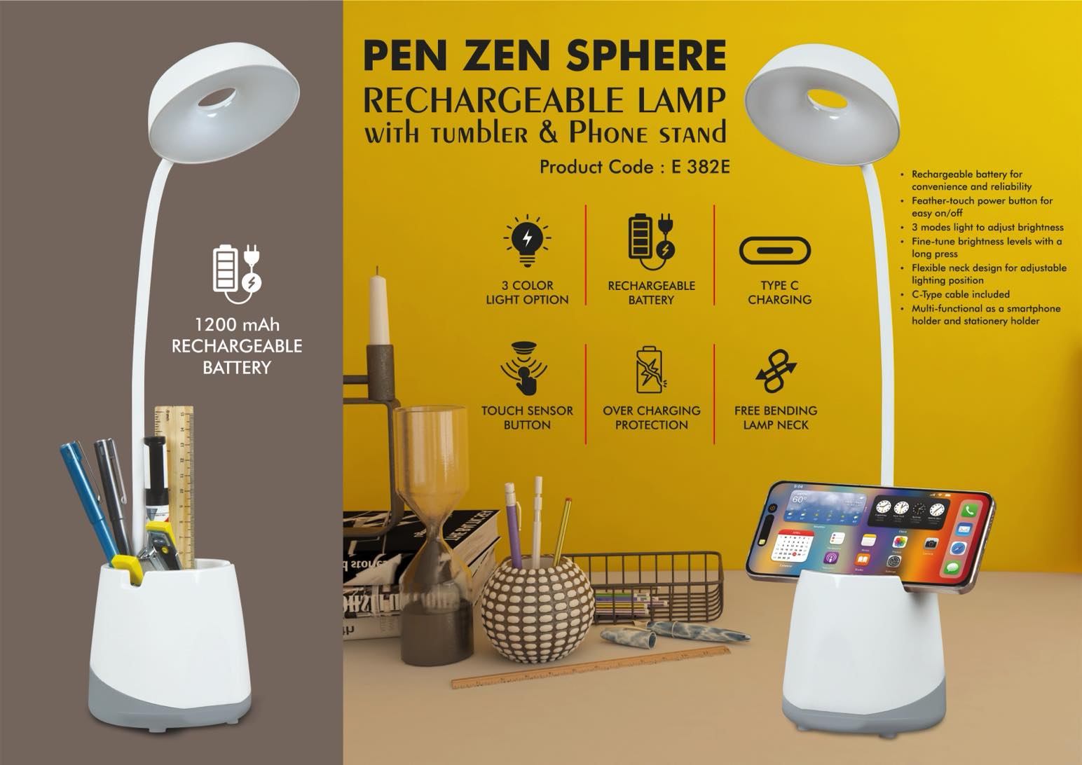 PenZen Sphere- Rechargeable lamp with tumbler and Phone stand – 3 Color light with Brightness adjustment – Type C Charging – 1200 mAh battery