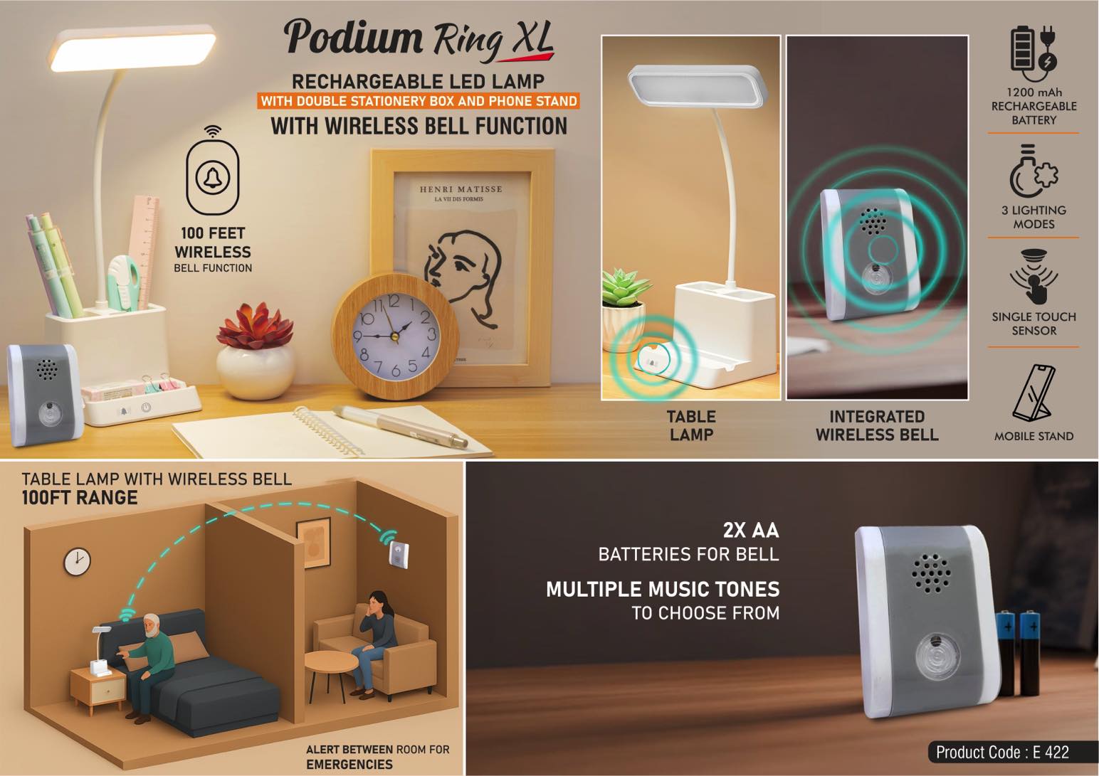 Podium Ring XL- Rechargeable LED lamp with Wireless Bell Function – Double stationery box and Phone stand – 3 Color light with Brightness adjustment – Type C Charging – 1200 mAh battery