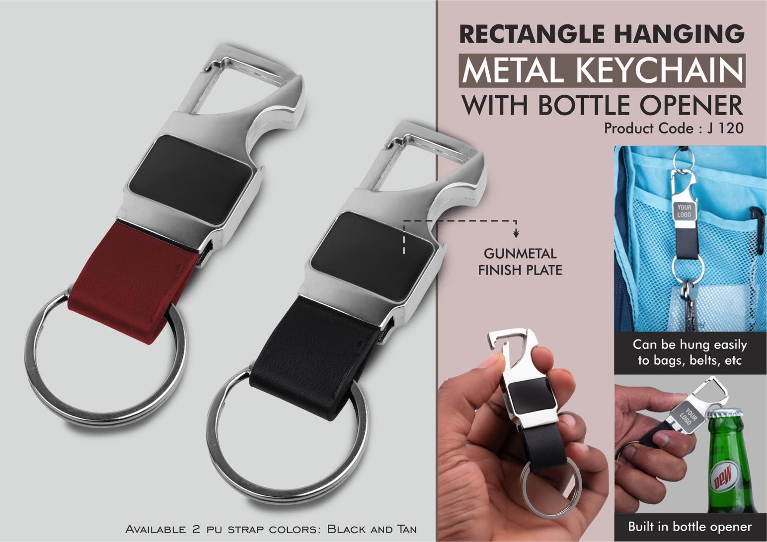 Rectangle hanging metal keychain with Bottle Opener – Black PU strap