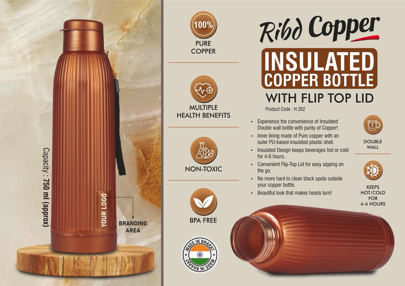 Ribd Copper : Insulated Copper Bottle with flip top lid – Keeps Hot & Cold for 4-6 Hours – Strap for Carrying easily – Capacity 750 ml approx