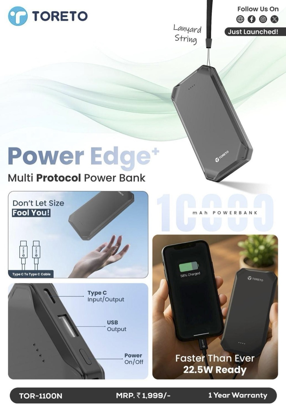 ZapX 10- 10,000 mAh Power bank with Display and In-Built Cables – 22.5W Fast charging – Supports Qualcomm 3.0 + PD charging – Dual USB output and inputs